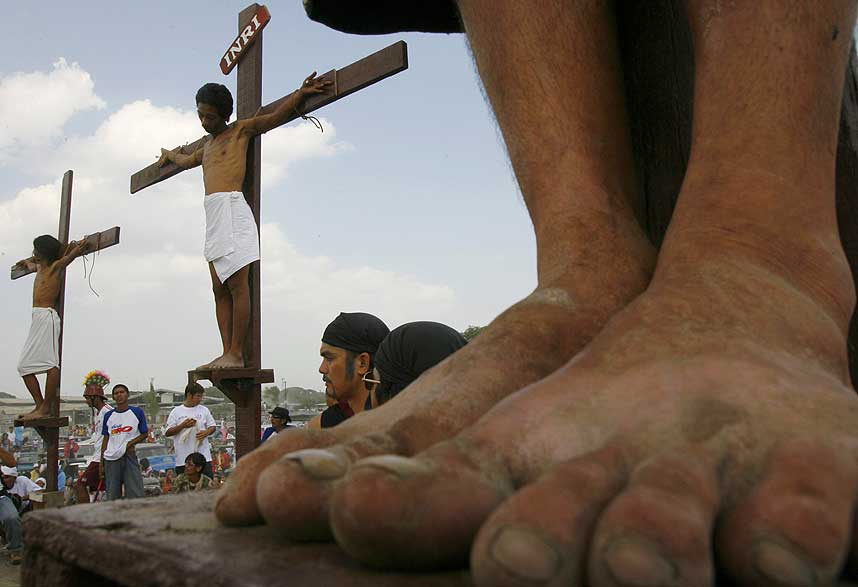 19 mennesker lot seg korsfeste, mens mange andre pisket seg selv til blods i den årlige markeringen av langfredag i Pampanga-provinsen på Filippinene. Victor viste ingen frykt og tok seg en sigarett mens han ventet på å bli hengt på korset fredag. Men han skrek i smerte og gråt da de 13 centimeter lange naglene ble kjørt gjennom håndflatene hans med hammer. Han var en av ni av innbyggere i landsbyen Cutud som langfredag ble spikret til korset på samme måte som Jesus. I landsbyen Santa Lucia gjennomgikk ti personer det samme ritualet. De blodige ritualene er blitt gjennomført i flere tiår og trekker hvert år flere tusen av troende og turister. I flere timer før korsfestelsene fredag pisket rekker av menn seg på ryggen med pisker og stokker dekket med glasskår. Den katolske kirken på Filippinene tar sterkt avstand fra lidelsesritualene og kaller dem en feiltolkning av troen. Men deltakerne sier de gjør botsgjerninger for familien. |